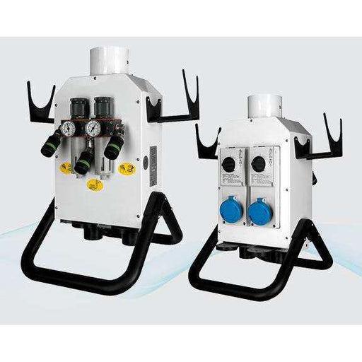 Power unit for feeding and suction of portable tools, equipped with electrical power outlets, quick couplings for compressed air (depending on the ...