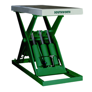 Southworth LS Series hydraulic lift tables are extremely rugged and reliable machines. Models are available in many basic sizes and capacities to lift and position loads up to 12,000 lbs. at heights to 98". The wide range of power options, controls, tabletops and base configurations that can be specified for each of the many basic sizes gives the user an almost unlimited choice of variations. The LS Series is used for machine feeding, work positioning, assembly, order picking, pallet loading and a wide range of other applications in a variety of industrial settings.