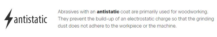KP222 achieves a long service life when processing non-conductive materials thanks to integrated antistatic fill materials. There is no need to use auxiliary materials. Abrasives with an antistatic coat are primarily used for woodworking. They prevent the build-up of electrostatic charge so that the grinding dust does not adhere to the workpiece or the machine.