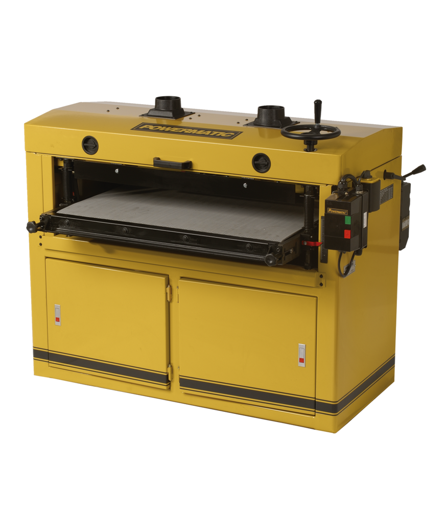 The production class Powermatic DDS-237 Dual Drum Sander that is loaded with features. A 10HP motor drives the dual steel drums, which have a hard durometer rubber coating to ensure a flat, mar free finish. Independently adjustable rear drum makes fine tuning easy. A heavy cast iron table incorporates four solid jackscrews with chain drive timing to keep it level at all times. The heavy-duty poly conveyor belt provides a positive grip on the stock. The 1/4HP feed motor is coupled to a two-speed forward/reverse gearbox that will sand 8 and 12 surface feet per minute. The heavy steel cabinet provides vibration free sanding, with plenty of storage space underneath.