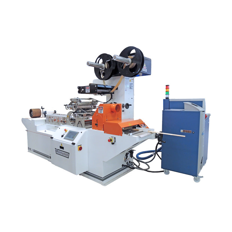 The HML-6 Profile Laminator applies hot melt adhesives to the back of various paper, foil, or vinyl webbing, and wraps the webbing around all types of profiled wood, extruded plastics and metal substrates.