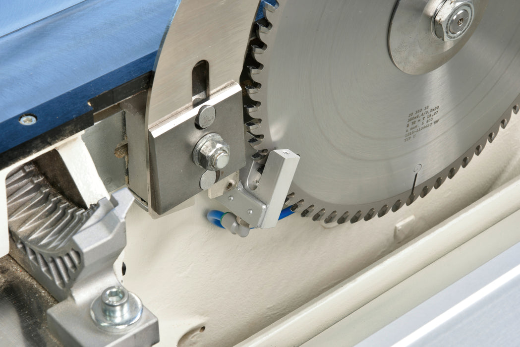 The Nova SI 300S has a massive cast-iron blade group which tilts on a trunnion mechanism. This closed system allows for maximum dust removal and is the most durable tilting design. The entire blade group raises and lowers on two steel columns, and the gear assemblies are encased in a patented mechanism which does not allow dust or pitch to penetrate the joining mechanism.