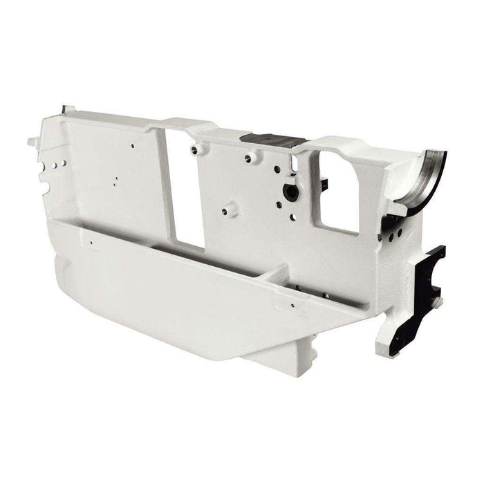 The double trunnion assembly for the blade tilting is part of the blade group casting. This eliminates the possibility of misalignment which exists when these parts are bolted in the place as some manufacturers do. Others use a small pivot pin to hold up the saw group.
