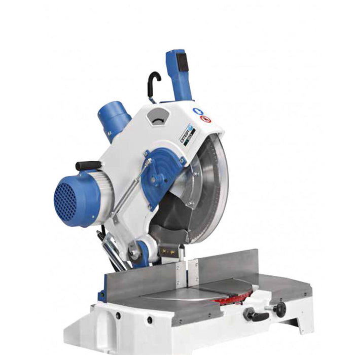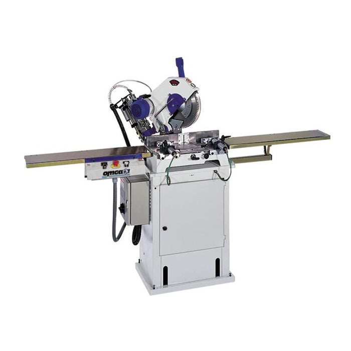 The heaviest duty of all model of OMGA's Precision Mitre Chop Saws (along with the T 53 370). It features a solid cast iron base and head construction. The rotating table rides on roller bearings for maximum smoothness and accuracy. Positive stops at 45, 30, 22 1/2, 15 and 10 degrees on both sides of the rotation and an independently fine tunable one at 90 degrees. A manual locking device for all the intermediate angles provides a great flexibility to this unit. The belt driven transmission and a powerful 3 HP induction motor make of the T 50 350 the ideal tool for heavy duty industrial usage. This machine is designed to be fitted with a wide variety of optional accessories to make it perfect for any application. This precision saw is a multi purpose machine suitable for use in general carpentry, for cutting moulding, picture frames, furniture components and any application requiring precision cutting.