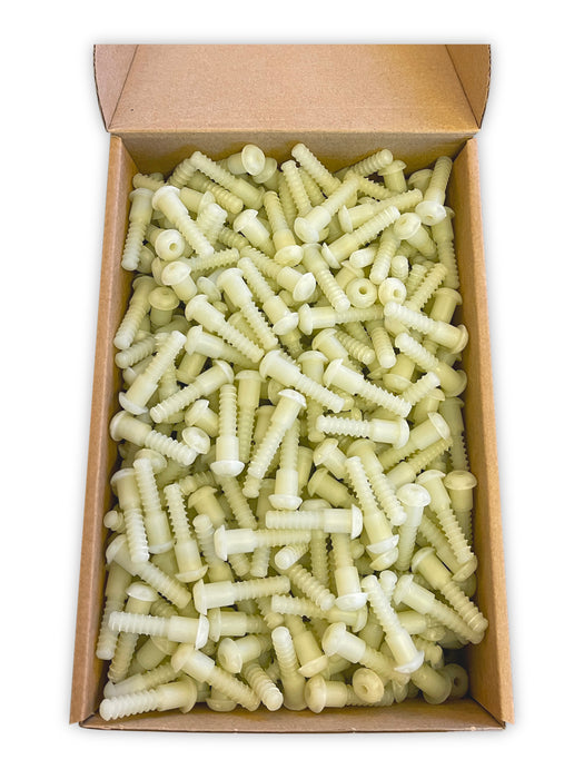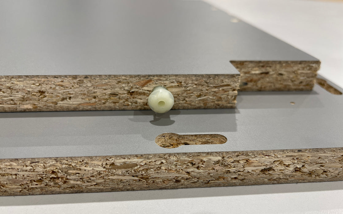 The Peanut 3 Long is a single-component, invisible connector and the optimum solution for large-scale manufacturers. It is designed for fast assembly and is compatible with end-drilling machines, auto-insertion machines, and large-scale production line insertion machines. The long dowel length provides an optimal solution for 90º and end-to-end connections. The component is solid filled, meaning that it has no holes for screws or pins. In assembly, the Peanut head rides over the lip of the Peanut slot and slides to the end. This action creates a strong clamping force, pulling the two panels together from the inside.