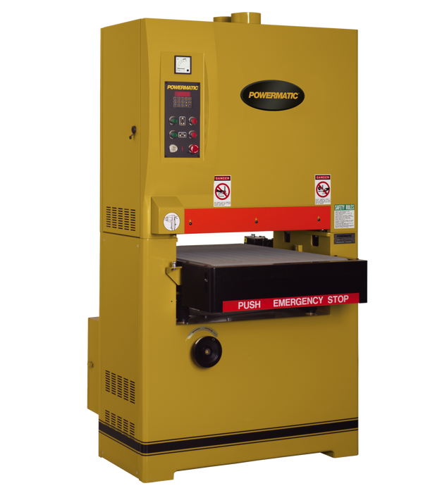 The POWERMATIC® 25" Wide Belt Sander delivers the utmost performance in measurement and sanding, creating a flawless finish every time. The Sander has centralized controls which allow the user to access all the needed buttons on one simple panel for more convenience. The variable speed feed belt allows the user to accurately dial in the exact feed speed to best suit each project and work environment. The sander also features a special digital readout control. This element is especially helpful because it will show the exact thickness of the finished piece or will allow the user to preset exactly what thickness they would prefer the finished piece to be. The sander also includes a unique measuring device, the auto thicknesser, that will capture the piece of wood to give the user an exact measurement of the starting thickness. The POWERMATIC® 25" Wide Belt Sander has an air-eye system which controls the oscillation for the 25" x 75" sanding belt. This prevents the belt from running off the end of the drums and uses the sanding surface in a more uniform manner. This also ensures sanding lines will not be left on the work piece. The sander also has a powerful three motor system for maximum performance. The first motor system allows for maximum horsepower to feed the drive drums. A second, smaller motor, directly powers the VS feed belt and a third, smaller motor, powers the feed table up and down to the desired thickness automatically and with ease. For safety, the WB-25 Sander has a disc brake, which slows the machine quickly and stops it instantly in the event of an emergency.