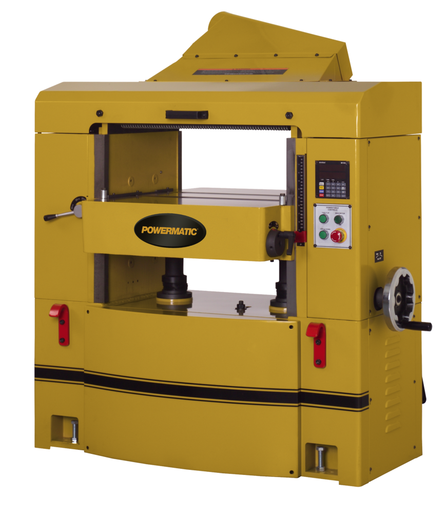 The POWERMATIC® WP2510 Planer has a solid steel helical cutterhead with 174 four-sided carbide knife inserts that require no adjustments when changing. With a digital readout and simple PC controller, setting up table heights is quick and easy. The frame is machined from heavy cast iron and has extra wide side panels that offer rigid bed support and ensure accurate alignment. The planer's segmented, serrated infeed roll with segmented chip breakers has an independent yield of 1/4. Its automatically adjusting, chain drive gear box powers the 3" diameter infeed rollers, solid pressure bar and dual outfeed rollers for precise feeding of stock. The 3-speed feed selector gives woodworkers flexibility by changing feed rates quickly and easily. The WP2510 Planer has a large 32-3/16" x 26" precision-ground table which contains two adjustable table rollers for smooth feeding of uneven stock. The planer has a Quick-Set micro-adjustable lever that easily raises and lowers the table rollers from 0 to 0.05".